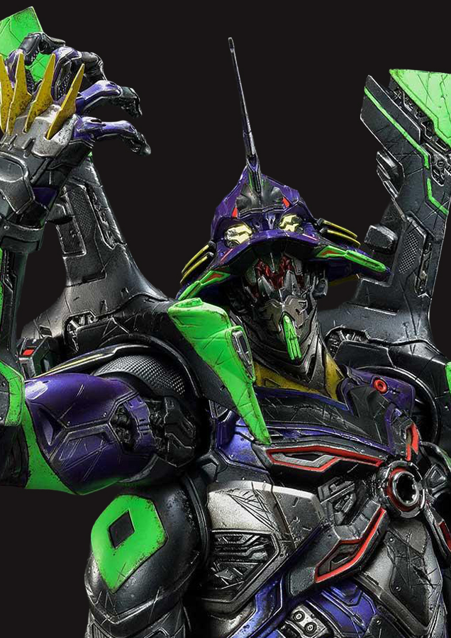 EVA-13 stands triumphant, over the destroyed remains of EVA-06, at a staggering 31 inches tall! The world might as well be a blank canvas to Josh Nizzi as he paints layer upon layer of realism and complexity into all his concepts. EVA-13 boasts an intricate redesign that features a reimagined portrait, body panels and armor-plating. EVA-13, in its Awakened Form, sports double-split eyes that our talented engineers at Prime 1 Studio have equipped with LED Illumination!