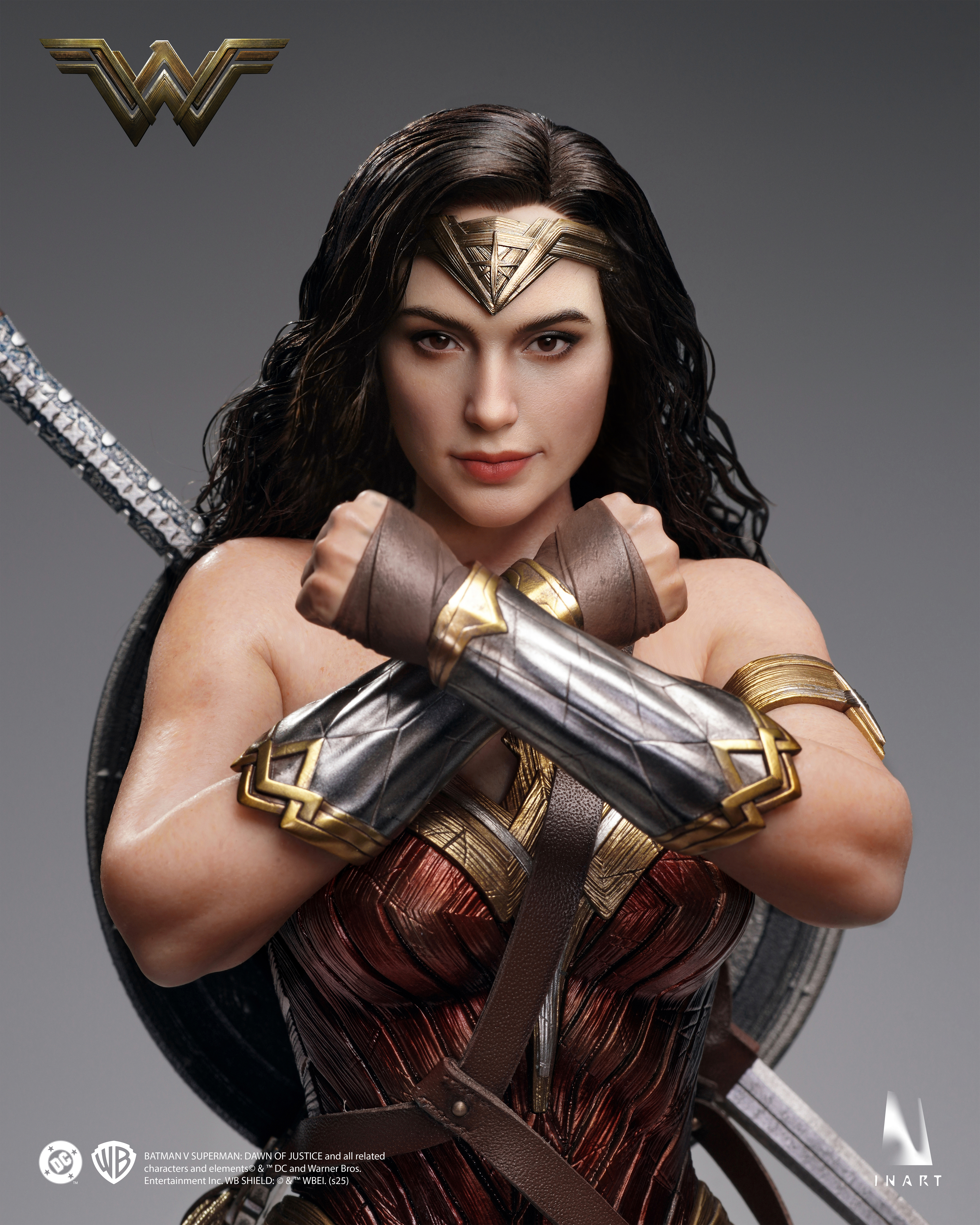 This INART Sixth Scale Collectible Figure is officially licensed by DC Comics. The figure faithfully replicates Wonder Woman's iconic look from her first appearance in Batman v Superman: Dawn of Justice. This premium outfit blends high-quality materials for a perfect fit and exceptional texture. Featuring a highly adjustable silicone body and five pairs of interchangeable hands, it flawlessly captures Wonder Woman's iconic movie look. With a sturdy base and metal stand for multi-angle display, it's the ultimate collectible for discerning fans.